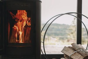 - Modern black fireplace with burning fire and firewood on metal stand on background of big windows with view on mountains. Cozy warm and calm moments at cold season.